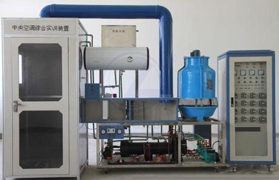 設備整體與實際中央空調(diào)系統(tǒng)結(jié)構(gòu)相同,采用開放式不銹鋼框架結(jié)構(gòu),各部件布局合理操作方便。系統(tǒng)由制冷機組、冷卻水系統(tǒng)、冷凍水系統(tǒng)、制熱系統(tǒng)、空氣調(diào)節(jié)系統(tǒng)(風管組件)、模擬房間、電控柜、計算機等部分組成,并配有集水器、分水器、膨脹水箱。