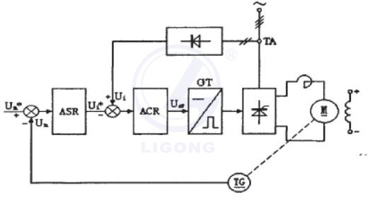 雙閉環直流調速系統采用速度環、電流環雙閉環控制系統,為了實現轉速和電流兩種負反饋分別起作用,在系統中設置了兩個調節器,分別調節轉速和電流,兩者之間實行串級聯接。這就是說,把轉速調節器的輸出當作電流調節器的輸入,再用電流調節器的輸出去控制晶閘管整流器的觸發裝置。從閉環結構上看,電流調節環在里面,叫做內環;轉速調節環在外面,叫做外環。轉速電流雙閉環控制的直流調速系統是最典型的直流調速系統,其原理結構如圖1.1所示。其中,ACR為電流調節器,ASR為轉速調節器, GT為脈沖觸發器,TG為測速電機,TA為電流互感器。