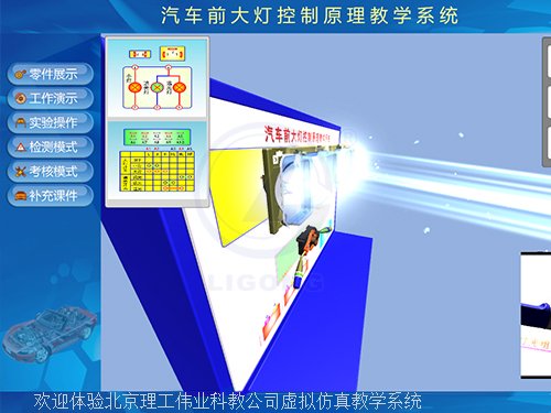 還有關(guān)于汽車前大燈控制虛擬仿真教學(xué)軟件中汽車前大燈的功能以及工作原理可電話咨詢,它隸屬于汽車教學(xué)軟件系列,適用于給雷院校對于汽車前大燈的培訓(xùn)與教學(xué)。