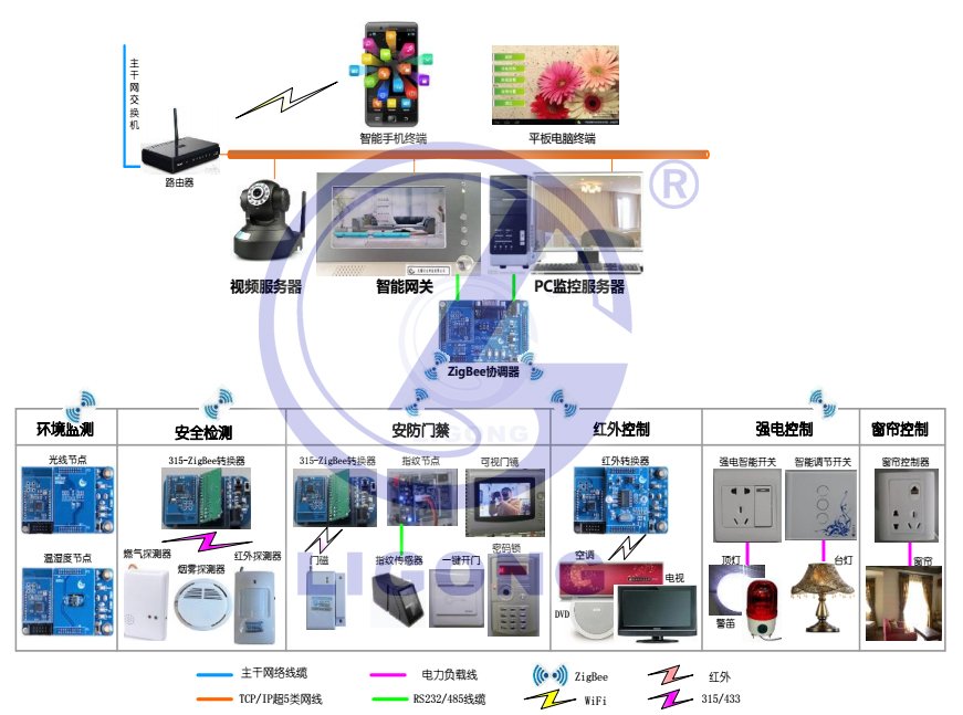 物聯(lián)網(wǎng)智能家居實(shí)訓(xùn)系統(tǒng)采用木質(zhì)板材搭建小型家居模型,安裝315頻段的燃?xì)狻熿F、門(mén)磁、紅外等各種探測(cè)器,不同功能的觸摸遙控面板,智能控制主機(jī),視頻監(jiān)控設(shè)備等;利用這些傳感器實(shí)時(shí)監(jiān)測(cè)家居環(huán)境狀況,結(jié)合嵌入式數(shù)據(jù)庫(kù)存儲(chǔ)技術(shù)將采樣數(shù)據(jù)統(tǒng)一保存管理;利用無(wú)線傳感器網(wǎng)絡(luò)統(tǒng)一管理各個(gè)節(jié)點(diǎn);利用自動(dòng)控制理論實(shí)現(xiàn)家居智能環(huán)境監(jiān)測(cè)與聯(lián)動(dòng)控制;利用嵌入式系統(tǒng)實(shí)現(xiàn)智能家居控制主機(jī);利用Android系統(tǒng)實(shí)現(xiàn)智能家居訪問(wèn)終端;整個(gè)系統(tǒng)結(jié)構(gòu)完整。
