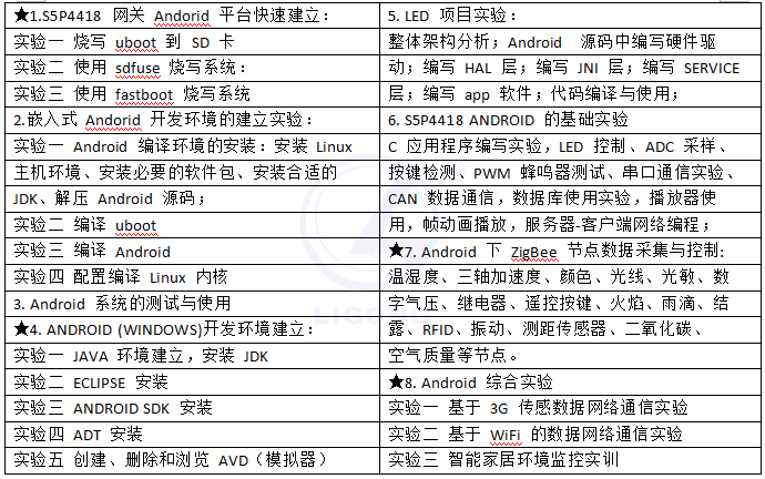 1、基于 Qt 的 WSN 網絡拓撲結構顯示實驗 2、基于 Android 的智能家居環境監控實驗 3、基于 Qt 的智能交通與停車管理實驗 4、基于 Android 的農業大棚遠程監控實驗 |