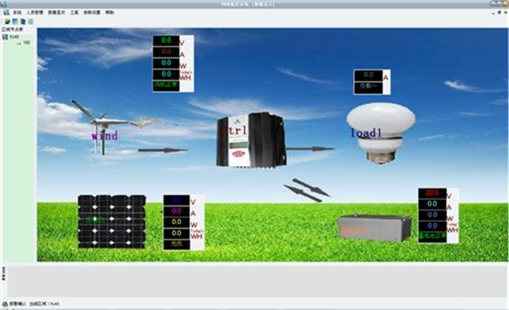 (2)顯示內容:蓄電池電壓、風機電壓、光伏電壓、風機電流、光伏電流、風機功率、光伏功率,能量模擬圖,當前風速(米/秒),當前風向(度),當前風力資源平估。