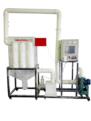 抽風機、投料槽、濾袋、除塵器、收集桶、震動調速器、電路控制系統、不銹鋼框架、控制屏。